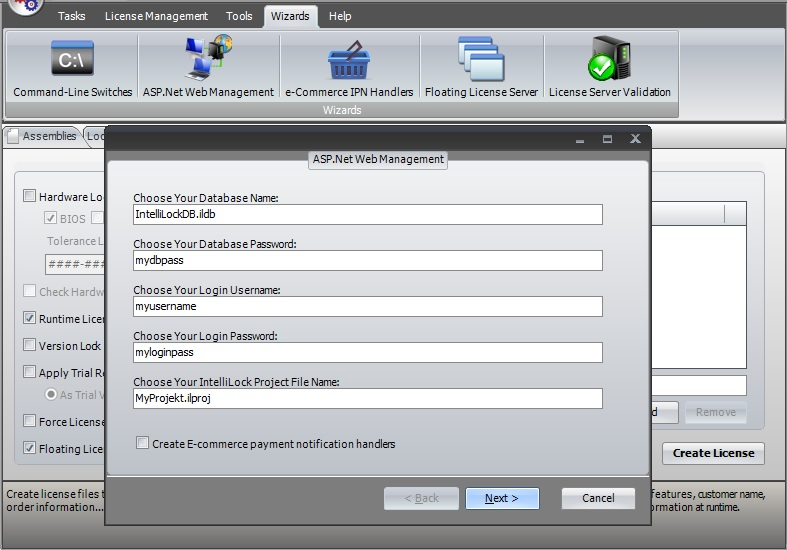 - It is important to use the same project file (as it contains the master key) to protect your application and generate the server files via Wizards > ASP.Net Web Management.
