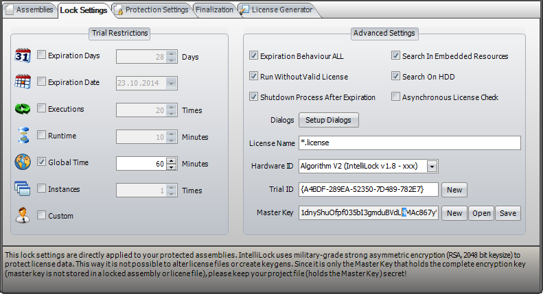 In the Lock Settings page you specify the licensing controls you want IntelliLock to build into your assembly when you protect it. These locks are implemented by additional code which IntelliLock includes in the protected assembly and requires no changes to your assembly source code to implement. One of the powerful features of IntelliLock licensing is that the settings you inbuild into your assembly can be overridden by providing a license file to your customer, meaning you do not need to supply a separate licensed version of your program - the trial version and full version are exactly the same, the only difference being the license file you provide to paying customers.